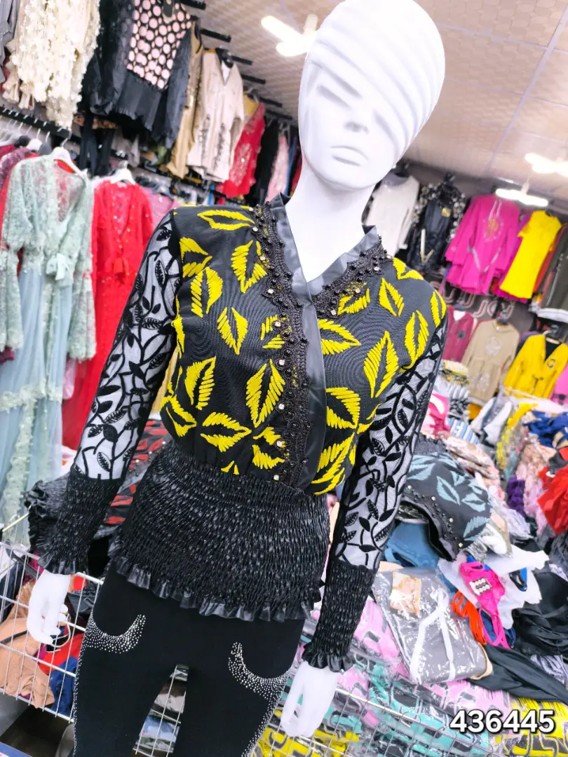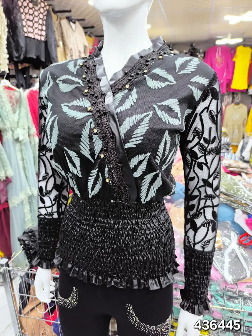 تصميم أسود فاخر مزين بنقوش أوراق حمراء 🍁 وأكمام شفافة ساحرة 🌫️، مع تطريزات لامعة عند الرقبة 💎 ولمسة كشكش أنثوية 🎀. الخصر المشدود يبرز القوام بجاذبية 💃مثالية لإطلالة مسائية مميزة أو مناسبة خاصة 🎉👠