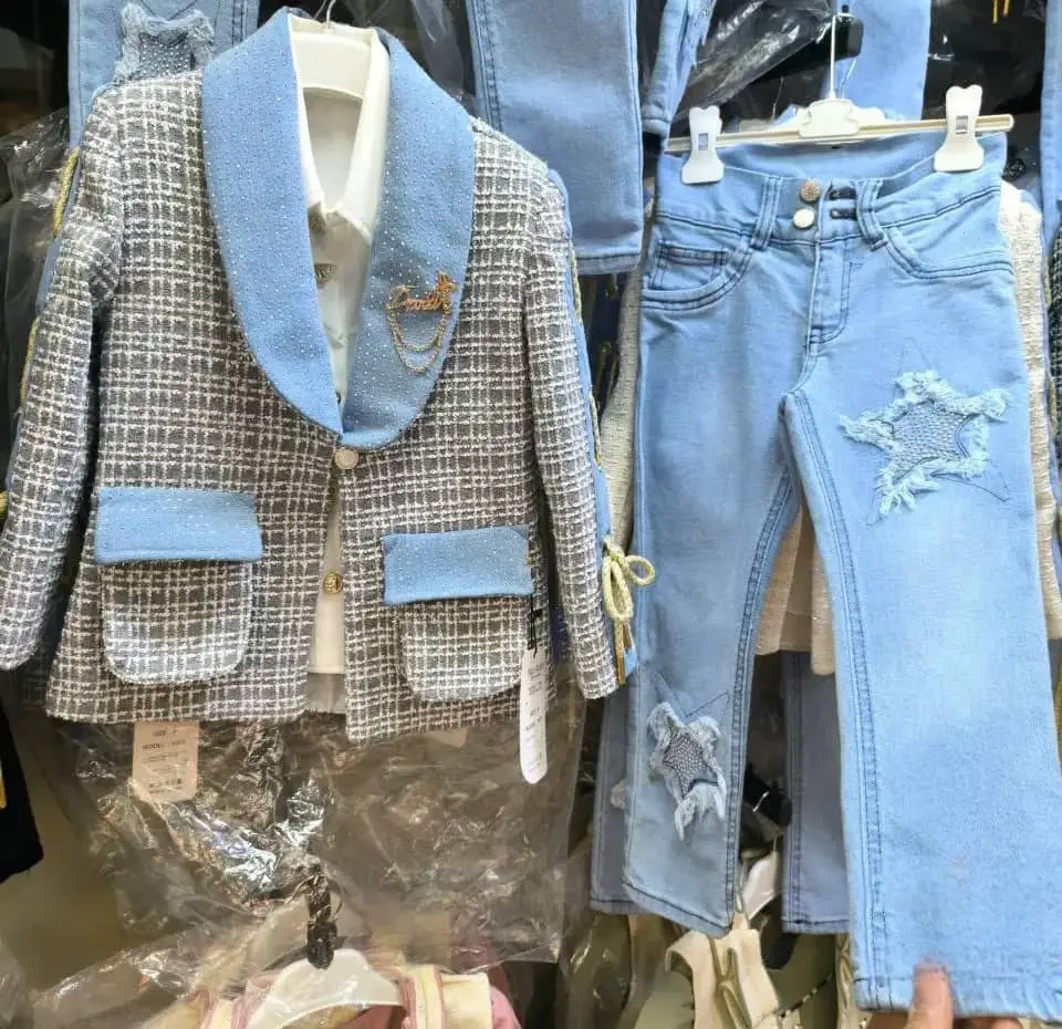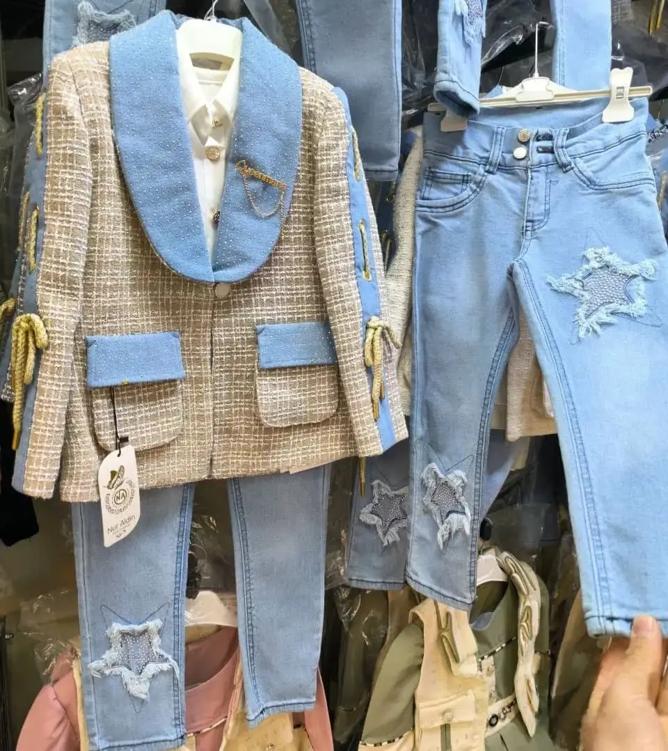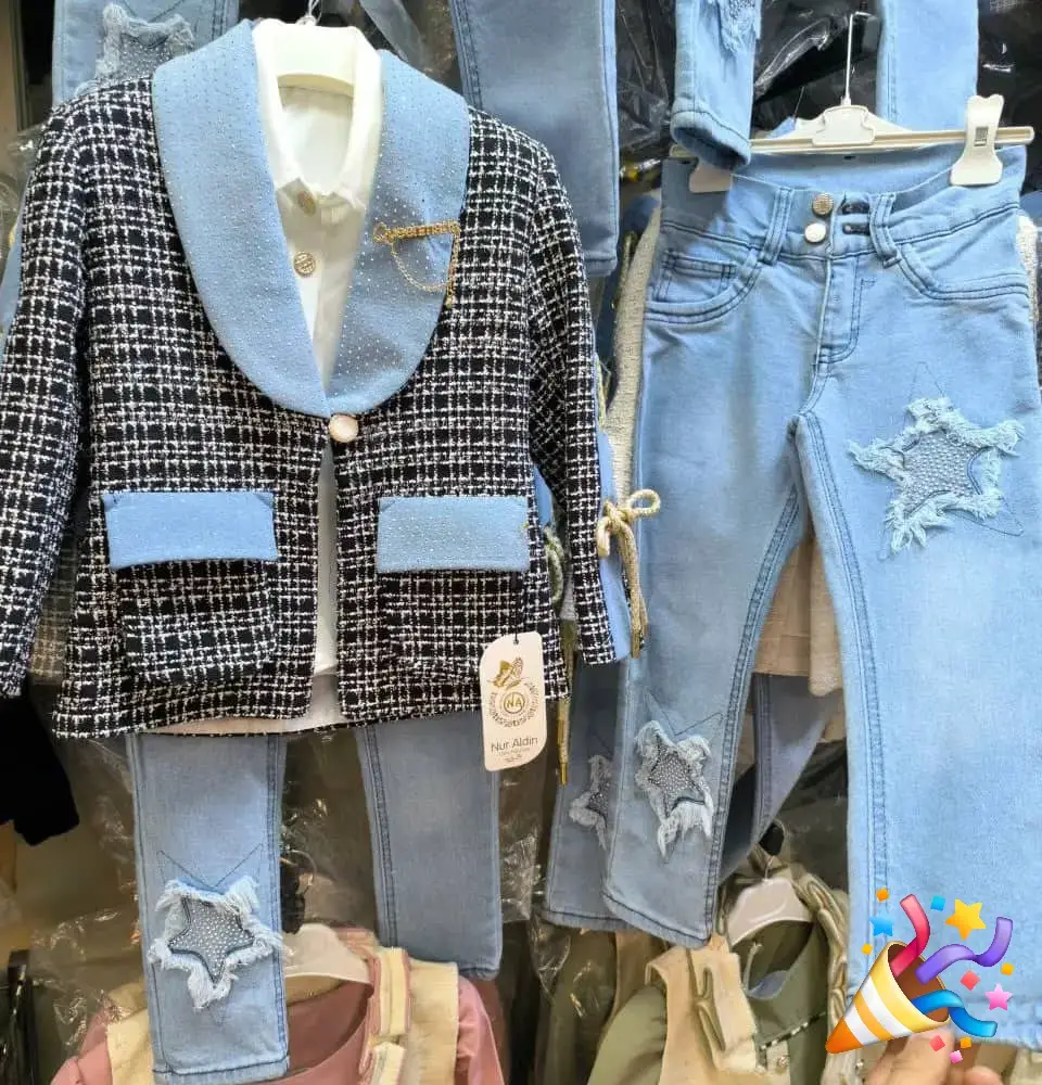 خلي طفلتك تتألق بإطلالة راقية مع هذا الطقم المميز المكون من جاكيت أنيق بتفاصيل لامعة وبنطال جينز عصري مزين بنجوم جميلة 🌟