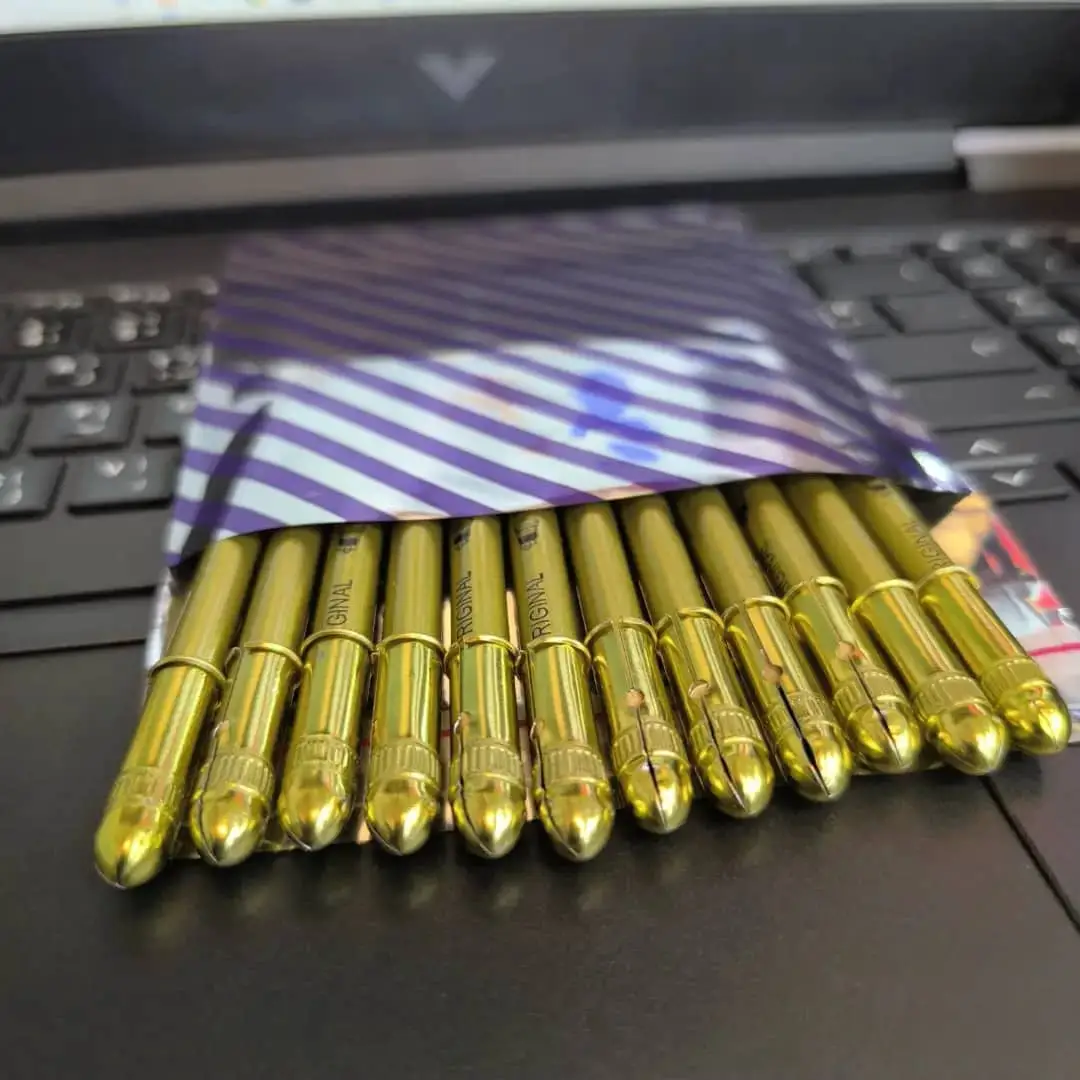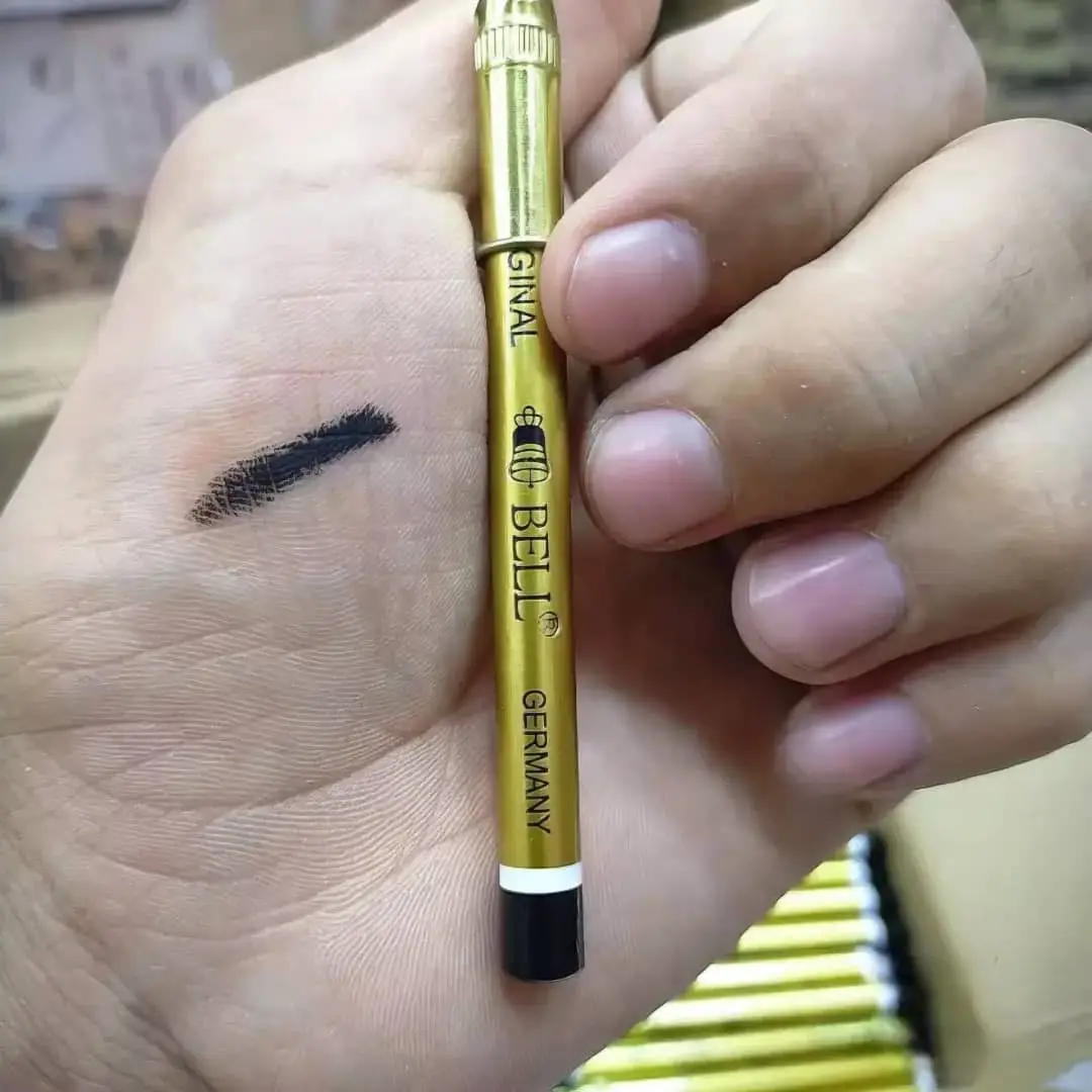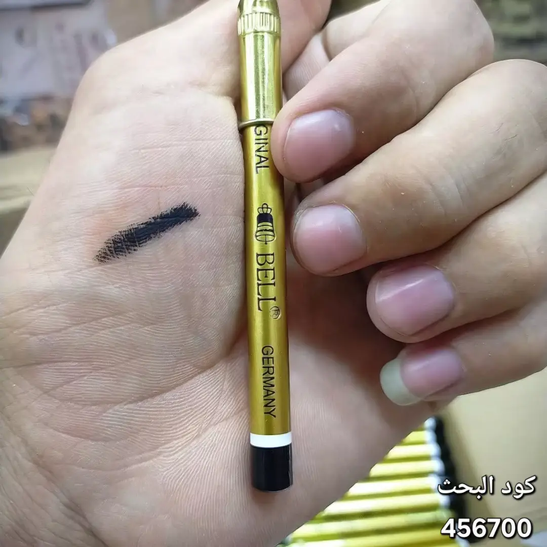 قلم كحل أو تحديد أسود فاخر وغني بلون فاحم، يتميز بعبوته الذهبية الأنيقة والمكتوب عليها "ORIGINAL BELL GERMANY". 👑 يستخدم لتحديد العينين بخطوط دقيقة أو سميكة، أو لملء ورسم الحواجب بشكل احترافي كما يظهر في الصورة. يمنحك نظرة عميقة وجذابة، وهو اختيار مثالي لـ مكياج السموكي! 👁️🗨️ ثابت وذو جودة عالية.