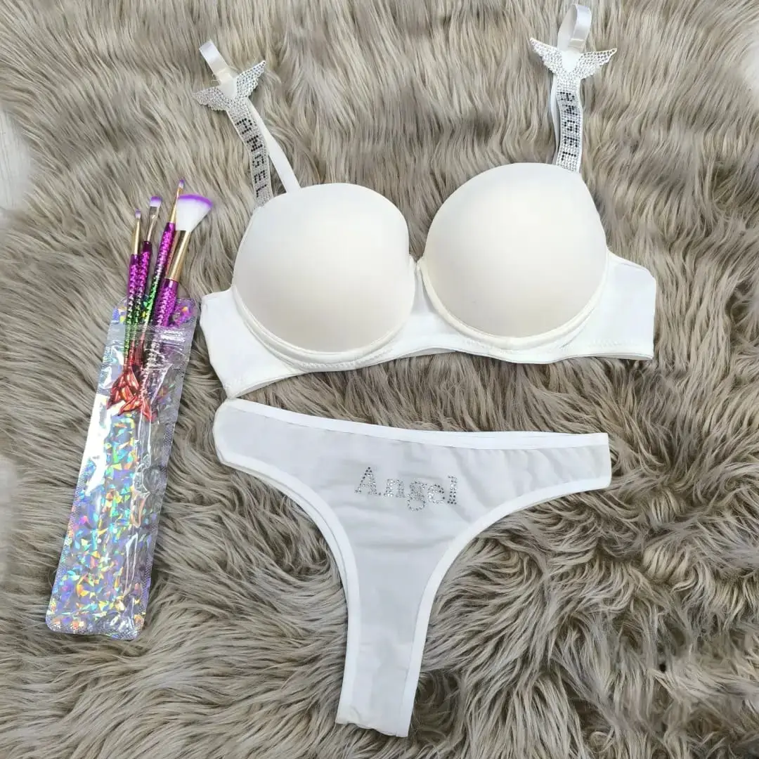 طقم داخلي نسائي مثير وأنيق يتميز بأشرطة حمالة صدر مزينة بأجنحة مرصعة بالكريستال اللامع 💎 وكلمة "Angel" المرصعة على السروال الداخلي. مثالي لإضافة لمسة ساحرة وخاطفة للأنظار لمجموعتك! 💖🔥