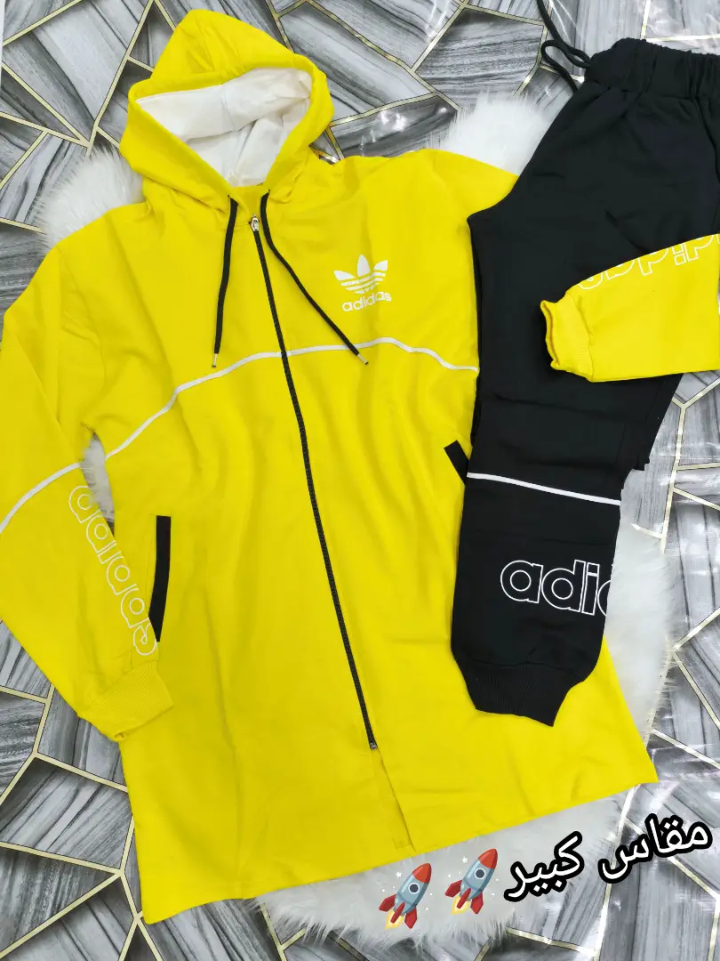 طقم رياضي بياخد العقل ومريح لأبعد الحدود! 😍 مكون من جاكيت طويل عملي ودافي مع طاقية وسحاب، وبنطلون رياضي بتفاصيل بتجنن 🏃♀️💨