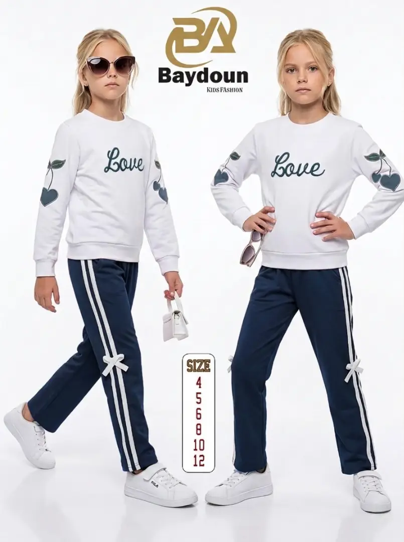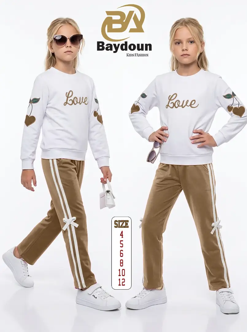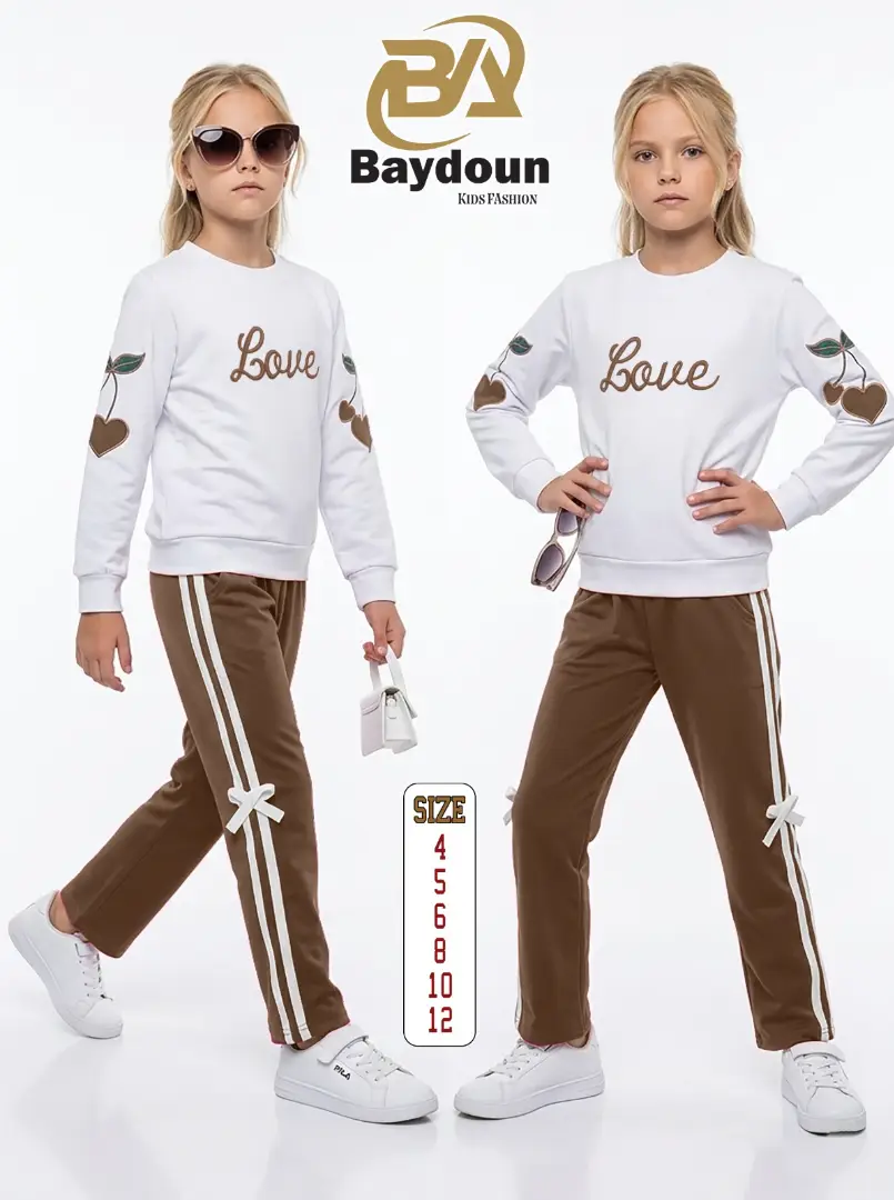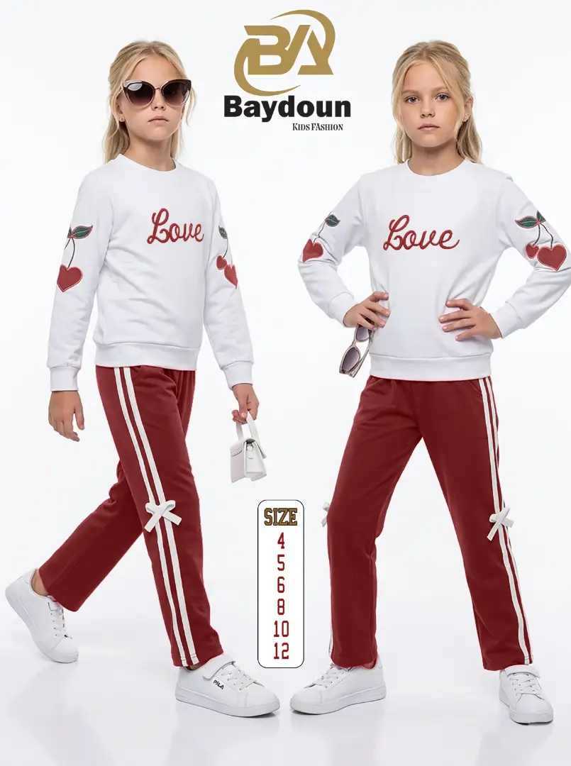 التطريز والموديل: بلوزة بيضا بتجنن مزينة بتطريز كلمة لـوڤ بارز ومرتب عالصدر وتطريز كرزات على شكل قلوب عالأكمام بياخد العقل 🍒🤍 مع بنطلون بألوان بتطير العقل مزين بشريطة ناعمة عالجنب 🎀